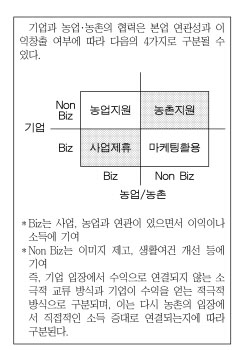 기업과 농업·농촌의 협력은 본업 연관성과 이익창출 여부에 따라 다음의 4가지로 구분될 수 있다.