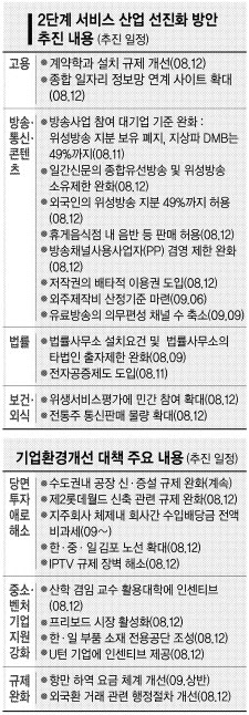 정부가 18일 발표한 ‘2단계 서비스산업 선진화 방안 및 기업환경개선 추진계획’은 ‘MB노믹스(이명박 경제정책)’를 본격 가동하기 위한 여러 분야의 규제 완화책들을 담고 있다. 기업 투자와 일자리 창출을 촉진해 우리 경제에 활력을 불어넣는다는 목표다.
