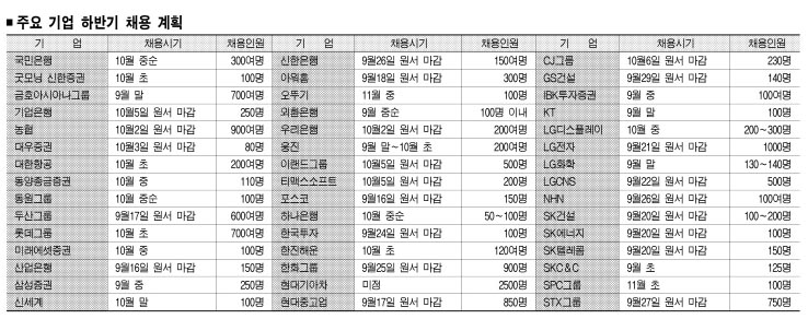 올 하반기에 삼성은 4000여명을 선발할 예정이고 LG 2400여명, 현대·기아자동차 2500여명 등 주요 그룹들이 예년에 비해 신입사원을 10∼20% 정도 더 뽑을 계획이다. 하지만 경기침체로 전반적인 취업 상황은 어려울 것으로 예상된다. 한국고용정보원 이시균 박사는 “취업 준비생은 60만여명을 훌쩍 넘어선 데다 최근 불거진 전세계적인 금융불안과 경기둔화 등으로 중소기업들의 채용규모는 오히려 줄어들 것”이라고 전망했다.