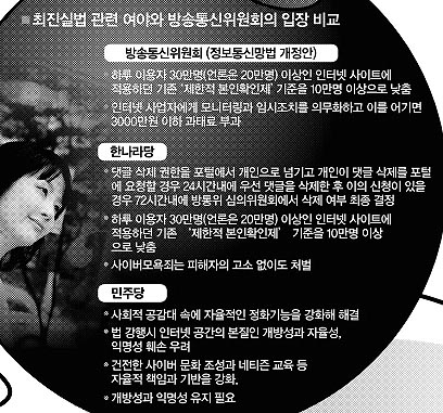 한나라당이 추진 중인 ‘최진실법’은 이를테면 ‘인터넷 통합법’이다. 사이버 모욕과 악성댓글 처벌 강화, 인터넷 실명제 확대 등뿐만 아니라 인터넷 문화와 사업 전반을 아우르는 내용을 담자는 것이다.