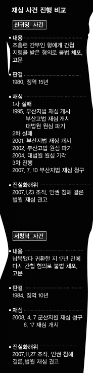5년 뒤 신씨 가족은 고문에 의해 위증했다는 당시 증인의 진술을 토대로 두 번째 재심을 신청했다. 부산지법은 재심을 허용했지만, 부산고법과 대법원은 배척했다. 지난해 1월23일 진실화해위원회는 신씨 사건을 간첩조작 사건이라 결론짓고 재심을 권고했고, 신씨는 같은 해 7월10일 세 번째 재심을 청구했다.1년이 지났지만 법원은 묵묵부답이다.