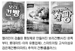 멜라민이 검출된 팽창제로 만들어진 건빵 제품은 추억의 건빵(유통기한 2009.10.8,14), 보리건빵(2009.10.7), 알뜰상품보리건빵(2009.10.5), 홈플러스 추억의 건빵(2009.9.22), 와이즐렉보리건빵(2009.10.5), 스마트이팅 고식이섬유 발아현미건빵(2009.10.6), 스마트이팅 고식이섬유 오곡건빵(2009.10.6), 스마트이팅 고식이섬유 검은깨건빵(2009.10.6) 등이다.