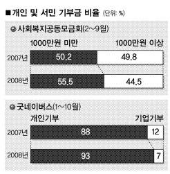 굿네이버스는 31일 경기 침체에도 불구하고 개인 소액기부의 증가로 기부액이 지난해 상반기에 비해 32%나 증가했다고 밝혔다. 개인기부액 비율은 지난해 88%에서 올해 93%로 늘었다. 반면 기업 등 법인기부액은 12%에서 7%로 줄었다. 사회복지공동기금회의 올해 1000만원 이상 기부금 합계는 28억여원에 그쳤으나 1000만원 미만 기부금은 34억 9780만원에 달했다. 아름다운 재단에는 지난 2개월간 고액기부자의 기부 상담이 한 건도 없었다. 지난해만 해도 1000만원 이상 기부 상담이 한 달에 10건이 넘었다. 반면 지난해 법인기부의 30% 수준이던 개인기부액은 올해 처음으로 법인기부액을 넘기 시작했다.