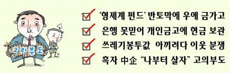 지난해부터 형제 및 사촌들과 월 5만원씩 내는 ‘형제계’를 해왔던 김모(30·보험회사 직원)씨는 최근 펀드 급락으로 형들과 소원해졌다.19개월을 납입했지만 300만원의 투자금은 150만원으로 줄었다.CMA(종합자산관리계좌)에 있던 돈을 펀드로 옮기자고 권유했던 큰 형이 책임을 인정하지 않으면서 결국 계와 우애가 모두 깨졌다.