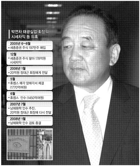 박 회장은 또 2006년 6월 농협 자회사 휴켐스를 입찰 때보다 322억원이나 싸게 인수했다.세종증권 주식거래에서 얻은 시세차익 가운데 50억원을 썼고,또 휴켐스 주식 84억원어치를 자신과 가족 등의 명의로 사들이기도 했다.농협과 박 회장 쪽은 인수 가격이 낮아진 것은 합리적인 이유가 있다고 강조하고 있으나 검찰은 로비 가능성도 배제하지 않고 있다.이와 관련,검찰은 농협이 휴켐스 매각 방침을 발표하기 2개월 전에 박 회장이 정 전 회장에게 20억원을 건넨 정황을 포착했다.