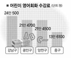 어린이 영어회화 월평균 수강료가 가장 비싼 곳은 강남구(24만 500원)로 가장 싼 중구(13만 6100원)와 2배가량 차이가 났다.강남구 다음으로는 광진구(21만 4700원),양천구(21만 4500원)가 뒤를 이었다.