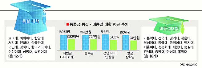 등록금의 경우 동결한 대학이 평균 794만원,그렇지 않은 대학이 772만원으로 동결한 대학이 평균 22만원 더 비싼 것으로 드러났다.동결한 대학 중 등록금이 가장 비싼 이화여대(880만원)는 비동결 대학 중 등록금이 가장 싼 성공회대(687만원)와 197만원 차이가 난다.비동결 대학 중 등록금이 중간 정도인 중앙대(750만원)와 비교해도 130만원 차다.2007년 대비 2008년의 등록금 인상률도 동결 대학은 평균 6.66%,비동결 대학은 5.82%로 평균 0.84% 포인트 차이가 났다.