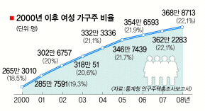 2002년 여성 가구주가 처음으로 20%를 넘은 이래 여성이 생계를 책임지는 양상은 꾸준히 늘고 있다.그러나 여성 가장들은 대부분 단순 노동을 하는 비정규직을 벗어나지 못한다.