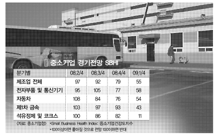 이를 반영하듯 중소기업청이 12월 말 1454개 중소기업의 수출 및 내수,수익성 및 자금사정 등을 조사해 발표한 2009년 1분기 중소기업건강도지수(SBHI)는 절망적인 수치로 나타났다(표 참고).특히 중소제조업체들은 올해 경제성장률을 2.4%로 예상했다.1997년 외환위기 이후 가장 낮은 성장률 수준이다.