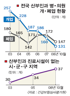 더 큰 문제는 산부인과 폐업 추세가 도시지역으로 확산되고 있다는 사실이다.인천시 옹진군,경기도 과천시,충남 계룡시,부산 강서구 등에서는 이미 출산 가능한 산부인과가 사라지고 한 곳도 없다.과천시의 L산부인과 직원은 “지난해부터 산모를 받지 않고 있다.”고 말했다.