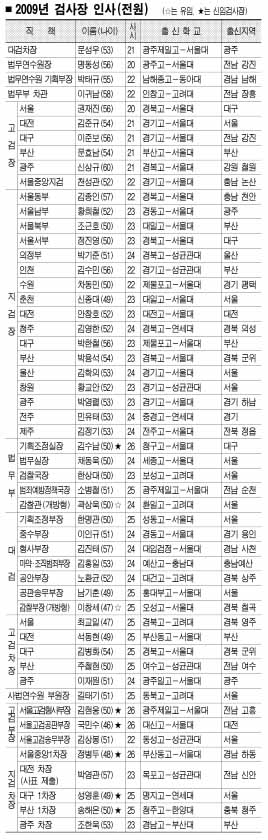 전국 검사장급 이상 간부 51명 가운데 김경한 법무장관과 같은 TK 출신과 임채진 검찰총장과 같은 부산·경남(PK) 출신은 각각 9명으로 동수를 이뤘다. 또 지역별로는 서울·경기 출신이 모두 15명으로 가장 많았고, 호남 출신이 11명, 충청 출신이 6명, 강원 출신이 1명이다. 특히 문성우 신임 대검 차장을 비롯해 호남 출신 인사가 전체 고검장급 9자리 중 4자리를 꿰차 가장 높은 비중을 이뤘다.