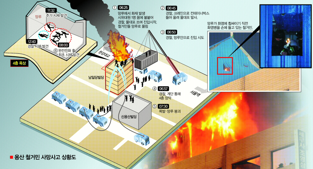 ●7시17분 망루 외벽이 뚫리고 특공대가 진입했다. 철거민 4명은 불길에 휩싸였다. 경찰은 “이제 그만 내려와라. 더 이상 다치게 하고 싶지 않다.”고 경고방송을 내보냈다.