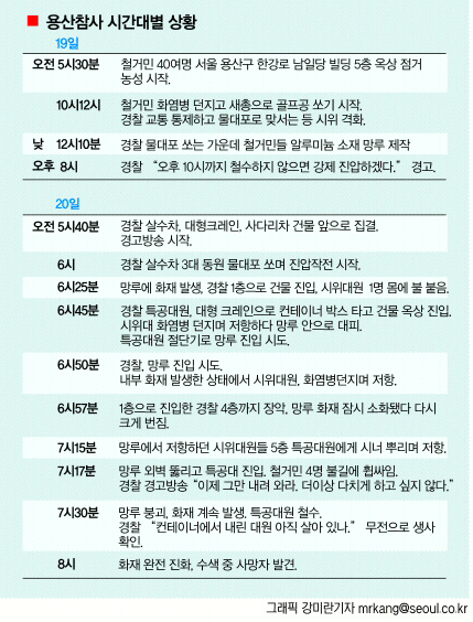 철거민을 물리력으로 누르려던 경찰의 강경진압이 대형참사를 빚었다. 당시 상황을 시간대별로 정리한다.