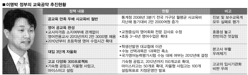 영어 공교육 완성 공약도 교육계 현장과는 거리감이 상당하다. 인수위에서는 교사자격증 소지 여부에 관계없이 영어전용교사를 2013년까지 2만 3000명 채용하겠다고 했었다. 하지만 현재 영어전용교사제는 교사중심의 영어회화 전문강사제도로 바뀌어 추진되고 있다. 교단에 서지 못한 사대 출신자들을 배려하려는 측면이 강한 이 정책을 이 차관이 바꿀지 주목된다.