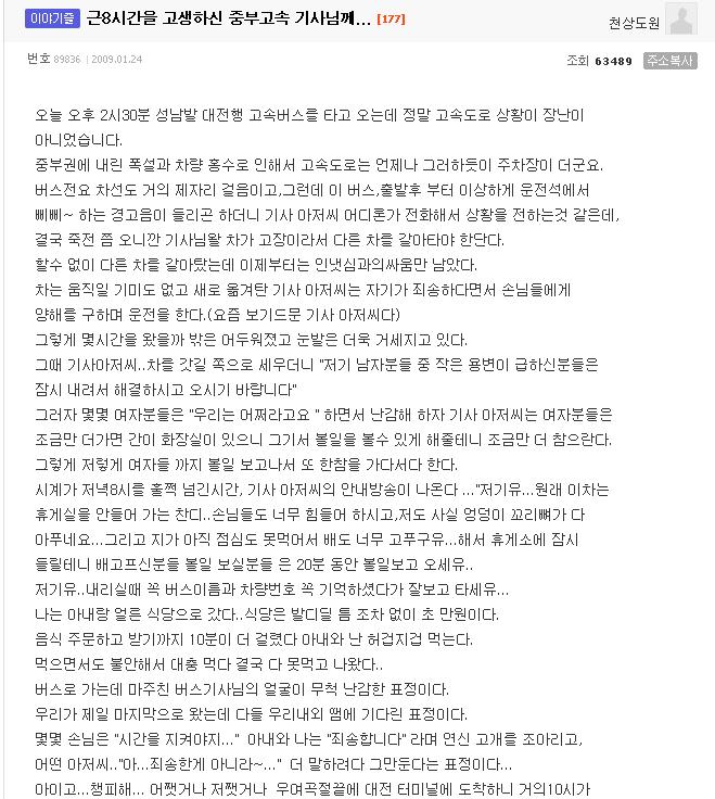 지난 24일 인터넷 포털사이트 다음 ‘이야기’ 게시판에 올라온 한 고속버스 기사의 훈훈한 미담이 네티즌들 사이에서 화제가 되고 있다.’천상도원’이란 네티즌이 올린 ‘근8시간을 고생하신 □□고속 기사님께’란 제목의 이 글은 짜증스럽기 쉽상인 귀성객들의 마음을 따뜻하게 녹여준 한 고속버스 기사의 이야기를 담고있다.
