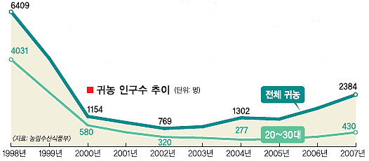 통계를 봐도 귀농하는 ‘2030’의 증가세는 뚜렷하다. 3일 농림수산식품부에 따르면 1998년부터 2007년까지 귀농한 2만 895명 중 20~30대는 9459명으로 전체의 45%를 차지한다. IMF 외환위기 시기인 1998년 ‘2030’ 귀농자 수가 4031명으로 폭발적으로 증가했다가 2000년대 초반 호황기를 맞아 주춤했지만 2005년엔 341명, 2006년엔 385명, 2007년엔 430명으로 증가세를 회복했다. 농림부는 경기침체가 본격화된 지난해도 전년보다 청년 귀농자가 10% 이상 늘었을 것으로 보고 있다. 현재 각 지방자치단체에서 숫자를 파악 중인데, 집계가 완료된 경기도와 충청남도의 귀농자 수가 전년에 비해 각각 42%(126명), 45%(227명) 늘었다. 인터넷에서도 귀농 정보를 교환하는 ‘2030’들의 모임이 많다. 대표적인 곳이 포털사이트 다음의 ‘귀농사모(www.cafe.daum.net/refarm)’로 5만 8000여명의 회원수를 자랑한다.