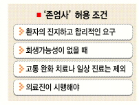 이어 이 부장판사는 “치료 중단이 허용되는 사례에 의해 일단 계기가 마련되면 마치 경사진 비탈면을 구르듯 허용 요건이 걷잡을 수 없이 확대돼 치료중단의 허용이 환자나 가족에 대한 강요나 압박으로 작용할 우려도 있다.”고 경고했다.