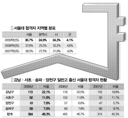 올해 서울대에 합격한 서울 시내 일반고 학생 두 명 가운데 한 명은 강남·서초·송파·양천구 등 이른바 ‘교육특구’ 출신인 것으로 나타났다. 서울대 전체 합격자(3276명)의 36.7%가 서울 출신인 가운데 서울 안에서도 지역 격차가 뚜렷하게 드러난 셈이다. 그동안 서울대는 “해마다 다양한 지역과 환경의 학생들이 늘어나고 있다.”고 밝혀 왔지만 지역 쏠림 현상은 오히려 심해지고 있다.이같은 현상은 해마다 심해지고 있다. 현재 입시체제가 갖춰진 2000년 이 4개구 소재 일반고 출신의 서울대 합격자는 서울 시내 전체 1178명 가운데 524명(44.4%)이었다. 매년 조금씩 증가하던 비율은 2007년 45.3%(374명), 2008년 46.7%(405명)를 기록했다. 올해는 지난해보다 2.6%포인트나 증가했다.