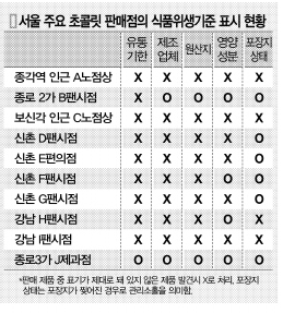 서울신문은 10일 서울시청 식품안전과가 제공한 식품위생 단속리스트를 토대로 서울 강남·신촌·종로 일대의 초콜릿 판매점 10곳을 점검했다. 조사 결과 9곳에서 식품위생법상 ‘식품 등의 표시기준 위반’ 제품을 발견했다. 9곳이 유통기한이 표시되지 않은 초콜릿을 팔고 있었고, 8곳은 제조업체나 원산지 표시가 없는 제품을 진열했다. 성분 표시가 없는 제품도 6곳에서 발견됐다. 서울시의 단속 기준은 유통기한·제조업체·원산지·영양성분의 미표시나 포장지 상태 등이다.