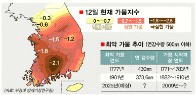 이에 대해 전문가들은 ‘가뭄 대재앙’의 전조에 불과할 뿐이라고 입을 모으고 있다. 부경대 환경대기학과 변희룡 교수팀에 따르면 연평균 강수량 500㎜ 이하의 최악의 가뭄은 124년을 주기로 되풀이됐다고 한다. 측우기를 활용해 강수량을 처음으로 재기 시작한 1777년 연평균 강수량은 430㎜였다. 당시 가뭄은 1771년부터 1783년까지 지속됐다. 1901년 가뭄 때 연평균 강수량은 373.6㎜였고, 1882년부터 1910년까지 이어졌다.
