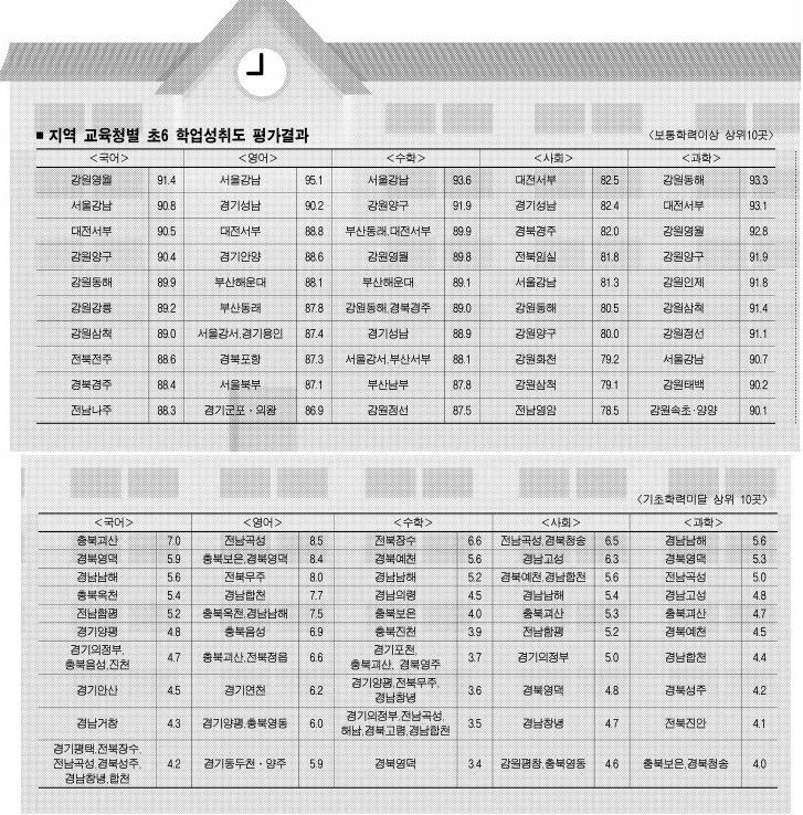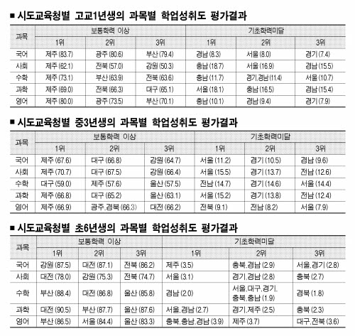 사교육열이 높은 분당을 낀 경기 성남교육청도 초6의 영어와 사회성적이 보통 학력 이상 기준으로 각각 3위권이었다.