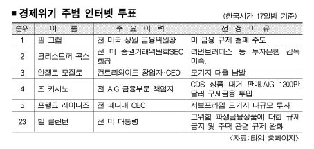타임은 클린턴·조지 부시 전 대통령, 필 그램 전 상원금융위원장 크리스토퍼 콕스 전 증권거래소(SEC) 위원장, 모기지업체 ‘컨트리와이드 파이낸셜’ 최고경영자(CEO) 안젤로 모질로, 앨런 그린스펀 전 연방준비제도이사회(FRB) 의장, 투자은행 리먼브러더스의 딕 펄드 CEO, 원자바오(溫家寶) 중국 총리 등 25명을 예비 주범으로 선정하고 인터넷판을 통해 투표를 실시하고 있다.
