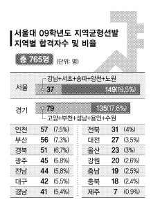 정시·수시를 합한 전체 합격자의 수도권 출신 비율도 증가하고 있었다. 지역균형선발제 시행 전인 2004년, 전체 합격자의 55.2%를 차지했던 수도권 학생 비율은 지난해 57.4%, 제도시행 5년째인 올해 58.4%를 기록했다. 제도 시행 전보다 불균형 현상이 심화된 것이다. 전국 고3 학생 가운데 수도권 학생 비율은 48.9%다. 제도 도입당시 28%까지 떨어질 거라던 서울출신 합격자 비율도 2004년 38.1%, 올해 36.7%로 거의 변화가 없었다.