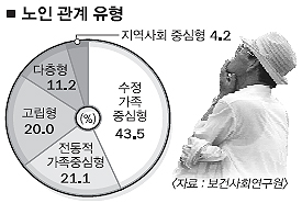 노인 중에서 가장 많은 유형은 자녀와 떨어져 살면서도 가끔 만나지만 친구나 지역사회 사람과는 거의 만나지 않는 ‘수정 가족중심형’으로 43.5%였다. 자녀와 동거하거나 별거하는 자녀와 긴밀하게 접촉하지만 친구나 이웃과는 접촉하지 않는 ‘전통적 가족중심형’도 21.1%를 차지했다.