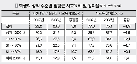 소득수준별로도 월 700만원 이상 가정의 1인당 월 사교육비는 47만 4000원인 반면 월 100만~200만원 가정은 10만 8000원, 월 100만원 미만 계층은 5만 4000원에 불과했다.