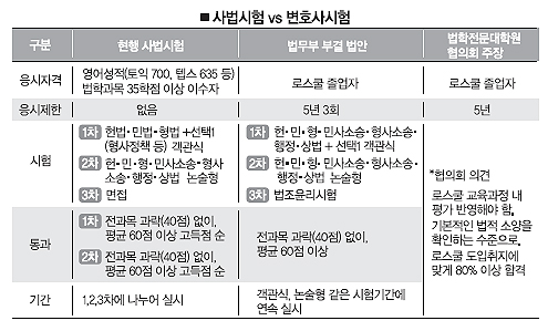 부결된 법안에 따르면 로스쿨을 졸업한 응시자는 1차 시험에서 헌법 등 주요법 7개 과목 객관식을 과락 없이 통과해야 한다. 또 2차 논술형에서 7개 법과목과 응시자가 선택한 1과목 시험을 치러야 한다. ‘교육을 통한 법조인 양성’이라는 원래의 취지를 무시하고 시험 과목만 따져봤을 때 현행 사법고시에 비해 과중한 부담이라는 지적이다. 사법시험은 1차 객관식 4과목(헌·민·형+선택 1과목), 2차 7개 법과목(헌·민·형+민사소송·형사소송·행정·상법)이 논술형으로 치러진다.