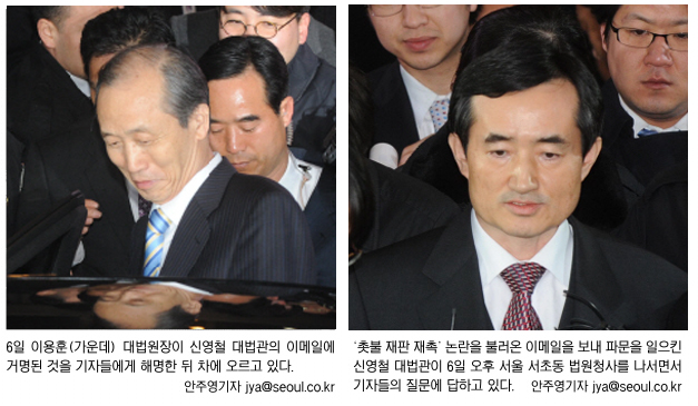 이용훈 대법원장은 6일 신영철 대법관의 ‘촛불재판 재촉’ 이메일 논란과 관련해 “사법 행정으로 볼지, 재판에 대한 압력으로 볼지는 사실 관계를 파악해 법리적으로 냉정하게 봐야 한다.”고 밝혔다.
