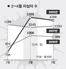 ‘봄철 자살’은 세계적으로 공통된 현상이다. 사회학자 에밀 뒤르켐의 책 ‘자살론’에서도 “대부분의 유럽국가가 여름, 봄, 가을, 겨울 순으로 자살률을 보인다.”고 했다. 우리나라에서도 마찬가지다. 통계청에 따르면 대개 2월에서 3월을 넘어가는 사이 자살자 수는 폭발적으로 늘어났다. 2005년 2월에 736건이던 자살자 수가 3월에는 1309건으로 573건이나 증가했다. 2006년 2월에 816건이던 수가 3월엔 1006건으로 190건 증가했다. 2007년의 경우는 2월부터 자살자가 늘어나 1월엔 806명이던 것이 2월에 1189명, 3월에 1141명이 됐다.