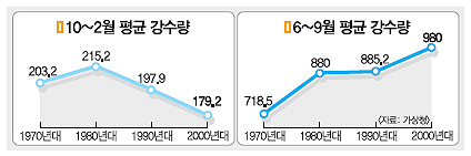 22일 서울신문과 기상청이 1973년 이후 36년간의 연도별 강수 데이터를 분석한 결과 가을철인 10·11월 평균 강수량은 1970년대에 103.3㎜, 80년대에 117.3㎜였지만 2000년대 들어서는 83.9㎜로 줄었다. 겨울인 12~2월 평균 강수량도 70년대에는 101.7㎜였으나 2000년대에는 90.9㎜로 감소했다. 두 기간을 합쳐서 10월부터 이듬해 2월까지의 평균 강수량은 70년대와 80년대에는 각각 203.2, 215.2㎜로 집계됐지만 90년대에는 197.9㎜, 2000년대에는 179.2㎜까지 떨어졌다.