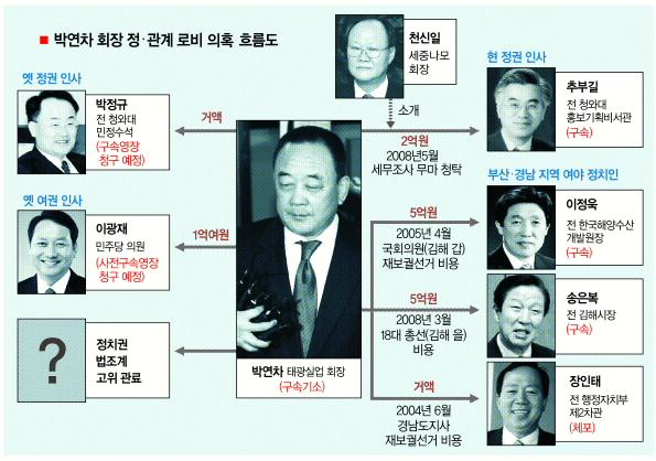 수사망에 걸려든 대상은 전·현 정권의 거물 정치인과 참여정부 실세들이 대부분이다. 박정규 전 청와대 민정수석·장인태 전 행정자치부 2차관(23일 체포), 이정욱 전 한국해양수산개발원장(구속), 송은복 전 김해시장(구속), 추부길 전 청와대 홍보기획비서관(구속), 이광재 민주당 의원(사전구속영장 청구예정) 등이다.