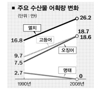 반면 온수성 어종인 오징어는 98년 16만 3000t까지 생산량이 떨어졌다가 지난해 18만 6000t이 잡히는 등 최근 20만t 안팎의 어획량을 보이고 있다. 주 어장인 동해에서 여전히 많이 잡히지만 수온 변화로 이동 경로가 바뀌면서 서해에서도 많이 잡힌다. 멸치도 90년 16만 8000t에서 지난해 26만 2000t으로 늘었다.