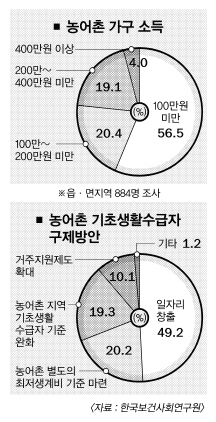 농어촌 가구의 절반 이상이 월소득 100만원 미만의 ‘극빈곤층’인 것으로 나타났다. 또 이들에게는 기초생활보장제도를 통한 직접적인 ‘소득 지원’보다 고정적인 수입을 올릴 수 있는 ‘일자리’가 필요한 것으로 분석됐다.