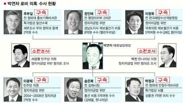 거침없는 검찰의 칼날은 장인태(58) 전 행정자치부 2차관과 박정규(61) 전 청와대 민정수석을 베었다. 장 전 차관은 2004년 6월 경남지사 보궐선거 직전 불법 정치자금을 받은 혐의다. 박 전 수석은 박 회장이 사돈인 김정복(63) 전 서울 중부국세청장의 인사검증과 관련한 청탁과 함께 1억원어치의 백화점 상품권을 받아 뇌물 혐의로 구속됐다.