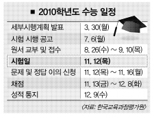 이번 수능시험부터 수리영역에서 정답이 한자릿수인 단답형 문항도 출제될 전망이다. 지금까지는 정답표기에 따른 채점과정상의 혼선을 막기 위해 두자릿수 이상의 답만을 요구하는 문제만 출제했다. 2010학년도 수능시험 세부 시행계획에 관한 자세한 내용은 평가원 홈페이지(www.kice.re.kr)에서 확인할 수 있다.