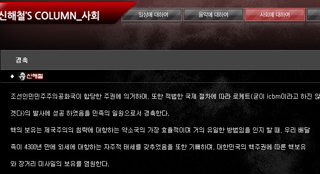 신해철은 8일 오전 공식 홈페이지(http://www.shinhaechul.com)에 ‘경축’ 이라는 제목의 글을 올리고 “조선인민민주주의공화국이 합당한 주권에 의거하여, 또한 적법한 국제 절차에 따라 로케트(굳이 icbm이라고 하진 않겠다)의 발사에 성공하였음을 민족의 일원으로서 경축한다.”고 밝혔다.
