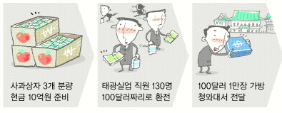 박연차 태광실업 회장이 정상문 전 청와대 총무비서관에게 100만달러를 전달하는 과정은 ‘007작전’을 방불케 했다. 인해전술로 ‘거액 환전’의 감시망을 피했고 단번에 100만달러를 건네는 대범함과 치밀함을 보였다.