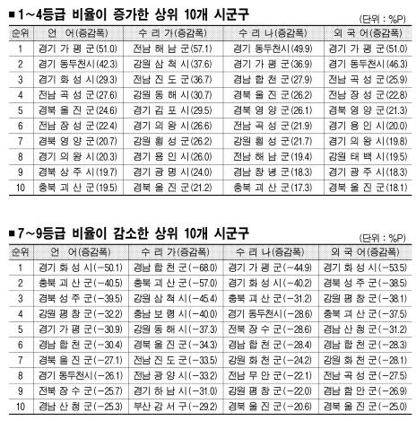 시군구별로는 경기 가평군이 언어에서 51.0% 포인트 올라 전국에서 수능 성적이 가장 많이 상승한 것으로 나타났다. 전남 해남군은 수리 가에서 57.1% 포인트 향상도를 보였다. 수리 나는 경기 동두천시(49.9% 포인트), 외국어는 경기 가평군(51.0% 포인트)의 향상도가 가장 컸다.