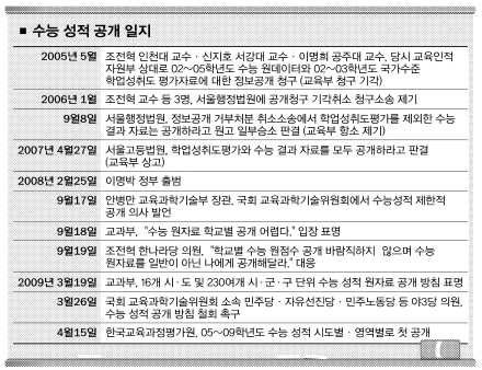 형식적으로는 한나라당 조전혁 의원이 수능 성적공개를 요구했기 때문이다. 조 의원은 국회의원이 되기 전부터 교과부에 수능성적 공개를 요청했지만 번번이 거절당했다. 이에 조 의원은 2006년 수능 원자료를 공개하라며 당시 교육부를 상대로 서울행정법원에 소송을 냈고 1·2심 모두 ‘성적 공개’판결을 얻어냈다. 교육부가 대법원에 상고해 현재 3심 재판이 진행 중이다. 조 의원은 지난해 9월 국회 교육과학기술위원회에 참석한 안병만 장관에게 “(지역간 성적 분석을 위해)수능 원자료를 공개해 달라고 요구했고 이에 안 장관은 “사회 문제를 야기하지 않는 것을 전제로 그렇게 하겠다.”고 답했다. 이후 공개범위에 대한 내부검토 끝에 교과부는 지난달 19일 16개 시도 및 232개 시군구 단위에서 성적을 공개하는 것으로 정했다.