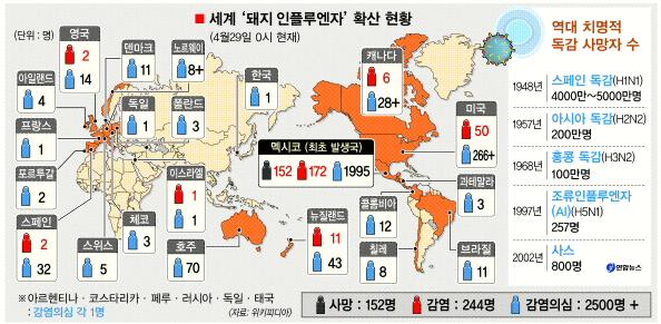 AFP통신에 따르면 멕시코에서는 돼지인플루엔자 사망자 수가 152명으로 증가했으며 의심 환자 수도 1995명에 이르는 것으로 파악됐다. 미국도 돼지인플루엔자 감염자 수가 50명으로 늘어났으며 캐나다는 6명이 감염된 것으로 확인됐다. 영국에서도 멕시코에서 휴가를 보내고 돌아온 스코틀랜드인 2명이 감염자로 확인됐다. 스위스와 덴마크, 스페인 등에서도 의심 환자가 계속 발견되고 있다.
