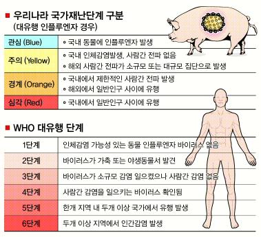 국가재난단계는 ‘관심-주의-경계-심각’ 모두 4단계로 나뉘어 있다. ‘주의’ 단계는 해외에서 발생한 전염병이 국내에 유입될 때 내려지는 조치다. 돼지인플루엔자가 국내에 들어왔음을 인정한 것이다.