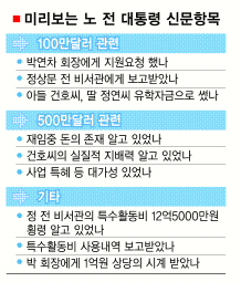 노 전 대통령에 대한 조사는 세 갈래로 진행된다. 500만달러팀과 100만달러팀, 12억 5000만원팀 등 소팀별 담당 검사들이 우병우 중수1과장과 릴레이 조사를 벌인다. 스타트는 500만달러팀이 끊는다. 500만달러팀 검사는 노 전 대통령이 박연차 태광실업 회장에게 돈을 요청했는지와 조카사위 연철호씨의 계좌로 돈이 전달된 사실을 재임 중 알았는지를 신문한다. 박 회장의 “노 전 대통령 요청” 진술과 아들 건호씨가 500만달러의 실질적 지배자임을 확인한 것을 근거로 들이댈 예정이다.