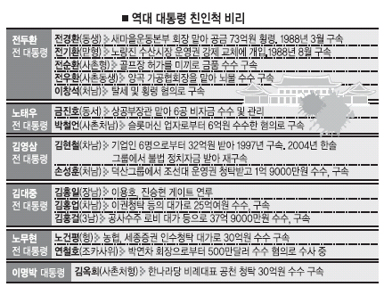 전임자들의 불행한 역사를 지켜본 노무현 전 대통령은 친·인척 관리에 심혈을 기울였지만 결과는 마찬가지였다. 형 건평씨와 조카사위 연철호씨, 아들 건호씨가 차례로 검찰 조사를 받았고 부인 권양숙 여사와 본인도 심판대에 오르는 처지가 됐다. 이명박 대통령만 해도 사촌처형 김옥희씨가 한나라당 비례대표 공천 청탁과 관련해 30억원을 수수한 혐의로 구속되면서 집권 첫해부터 골머리를 앓았다.