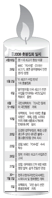 미국산 쇠고기 수입 중단을 요구한 시민들의 자발적 촛불집회가 2일로 1년이 됐다. 먹거리를 걱정하며 촛불을 들고 시작된 집회는 일반인들의 자발적인 참여와 비폭력성 등으로 ‘촛불문화’로 자리잡았다. 하지만 이후 정치·사회적 이슈가 생길 때마다 촛불이 저항과 압력 수단으로 활용된 경우도 적지 않아 또 다른 논란을 가져 왔다. 우리 사회의 새로운 소통문화 코드로 인식되고 있는 촛불집회 1년의 명암을 짚어 본다.