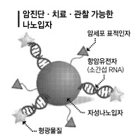 KAIST 생명과학부 박태관 교수와 연세대 화학과 천진우 교수팀은 자성을 띤 산화철 입자, 암세포를 추적하는 생체입자인 ‘펩티드(RGD)’, 암을 치료하는 ‘소간섭RNA(siRNA)’조각, 그리고 ‘형광물질’을 하나로 합해 암 진단 및 치료뿐만 아니라 자기공명영상(MRI)과 광학영상으로 관찰·촬영까지 동시에 할 수 있는 나노입자를 개발했다고 11일 밝혔다. 이번에 개발한 기술은 암세포의 진단·치료·관찰이 동시에 가능하다는 점에서 지금까지 진단 혹은 치료만 가능했던 것과는 차별된다.