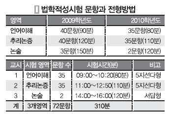 법학전문대학원협의회는 17일 이같은 내용의 ‘2010학년도 LEET 시행계획’을 공고했다. 시행계획에 따르면 올해 시험부터 5지선다형인 언어이해와 추리논증은 각각 40문항에서 35문항으로 줄어든다. 서술형인 논술은 3문항이던 게 2문항으로 줄어든다.