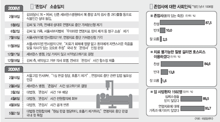 대법원이 21일 처음으로 ‘존엄사’를 인정함에 따라 관련 법률이나 병원의 지침 마련이 급물살을 탈 것으로 보인다. 하급심 법원이 존엄사 인정 판결을 내놓고 고(故) 김수환 추기경이 연명치료를 거부한 것으로 알려지면서 변화의 바람은 이미 시작됐다.서울대병원은 말기 암 환자가 의식을 잃었을 때 연명치료를 받지 않기로 사전의료지시서에 서명한다면 이를 받아들이기로 했다. 죽음의 방식을 본인이 결정하는 ‘사전 의사결정’ 제도를 공식 도입한 것이다.